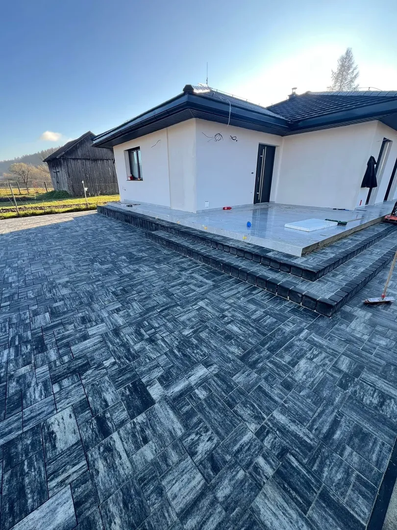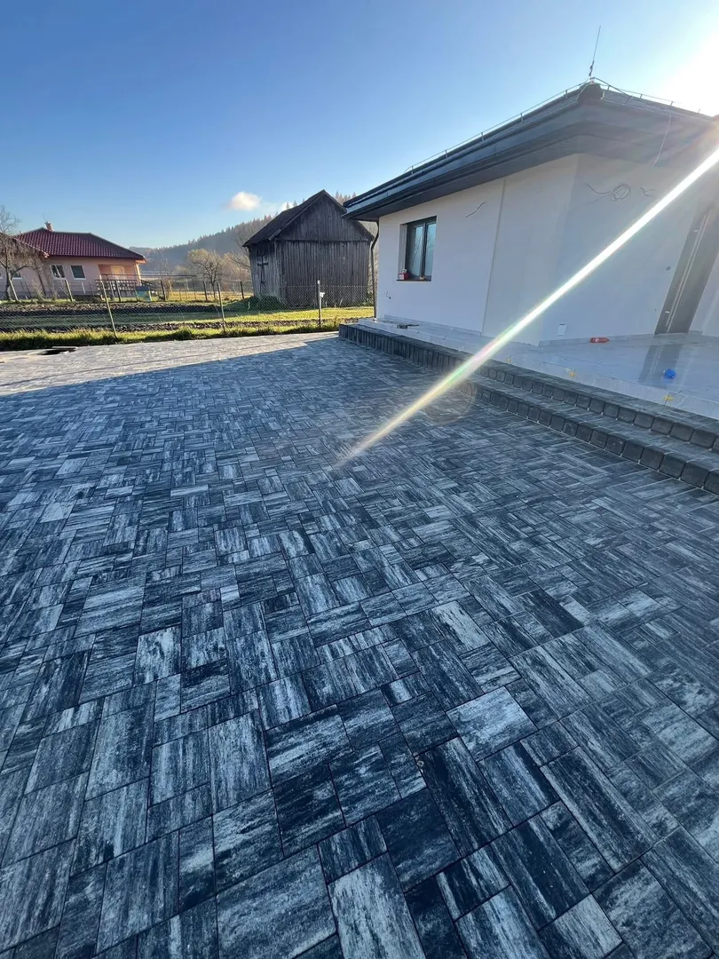 Projekt v obci Plaveč zahŕňal kompletnú pokládku zámkovej dlažby a osadenie betónových palisád v okolí rodinného domu. Po príprave a zhutnení podkladu bola položená dlažba v modernom tmavom prevedení, ktorá vytvára odolnú a reprezentatívnu spevnenú plochu.