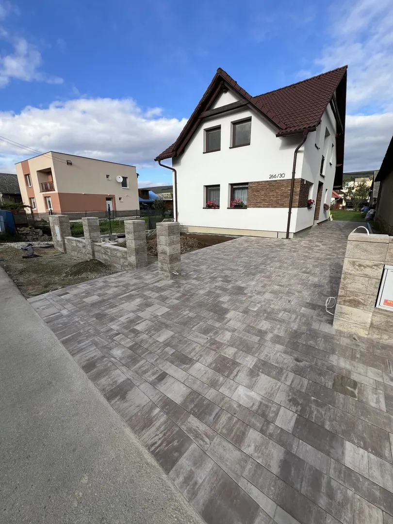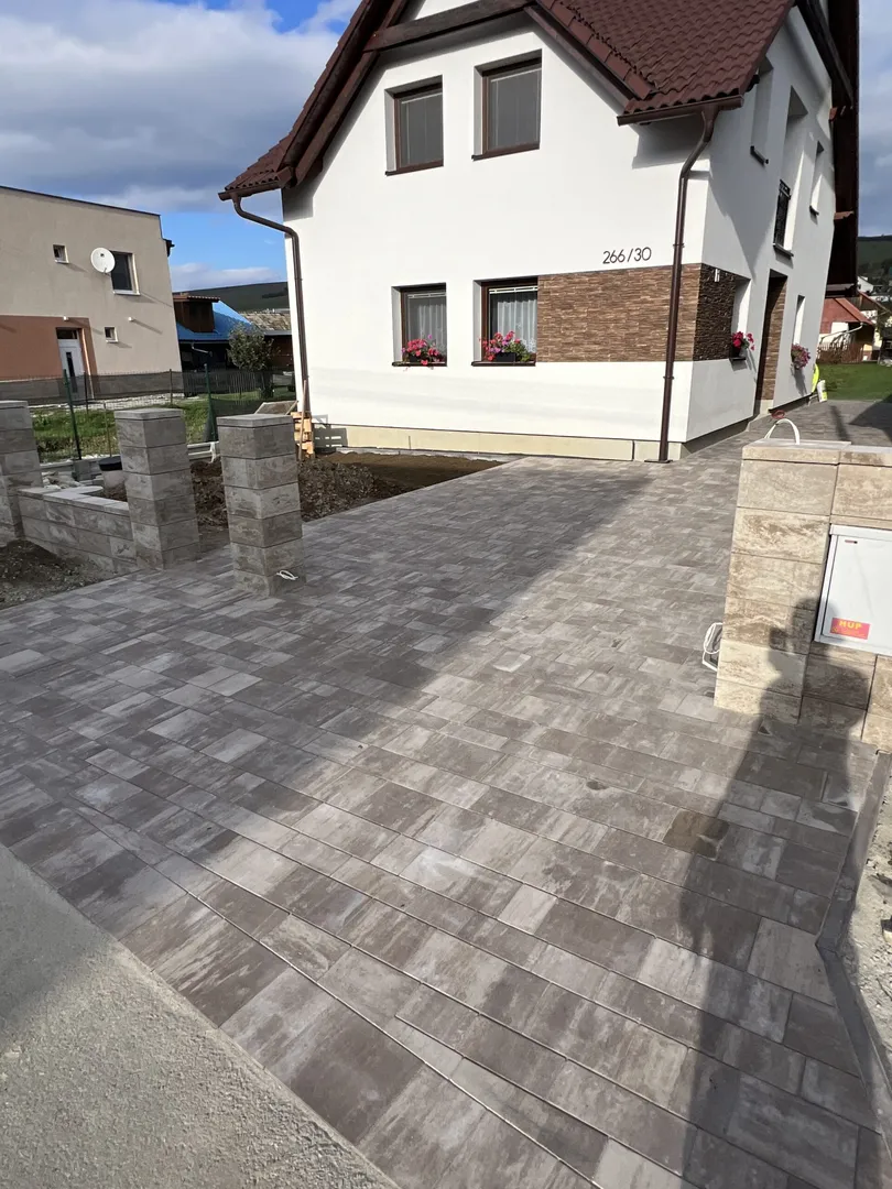 Pokládka zámkovej dlažby pri rodinnom dome v Ľubotíne.